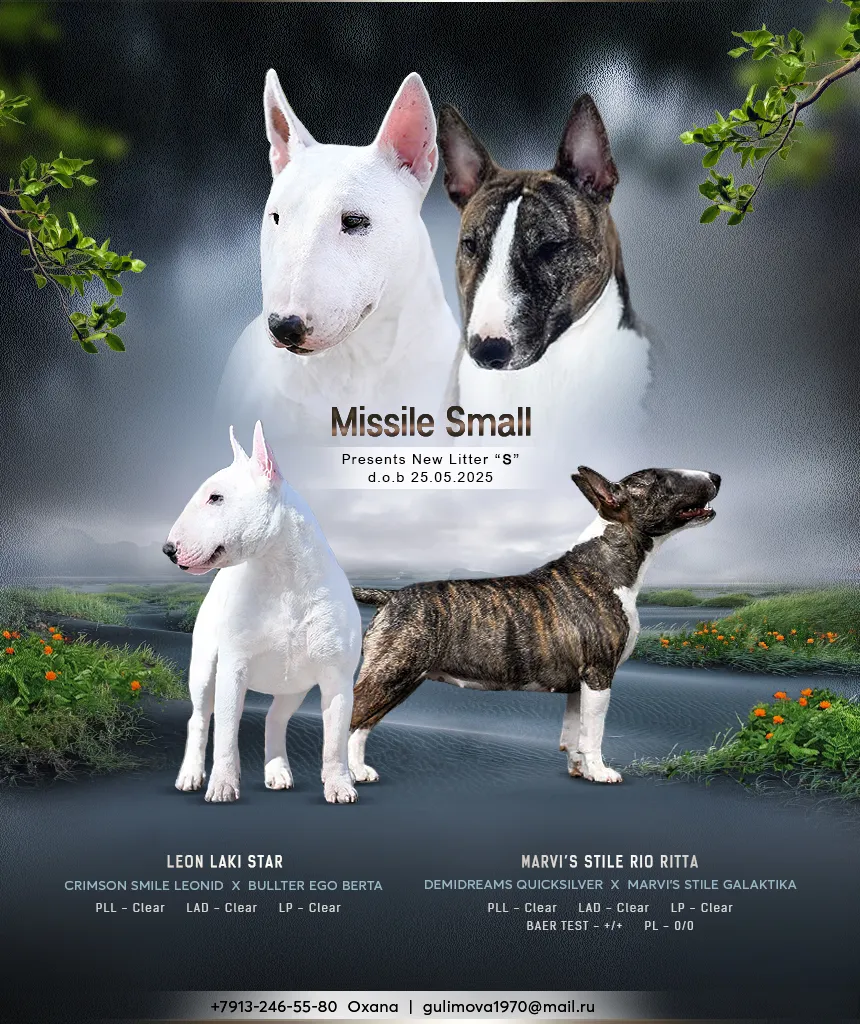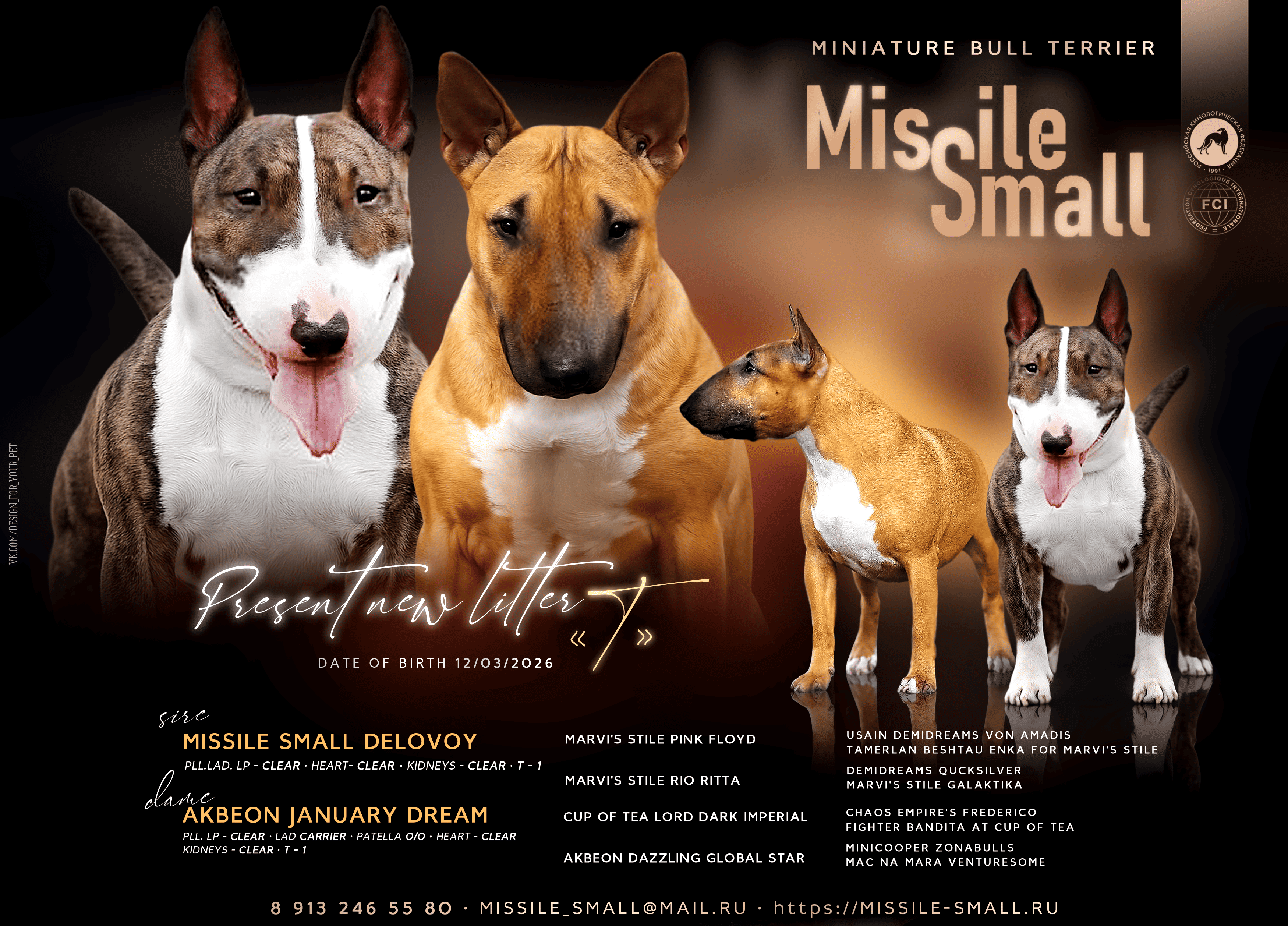 Предлагается красивая девочка миниатюрного бультерьера MISSILE SMALL CRUELLA